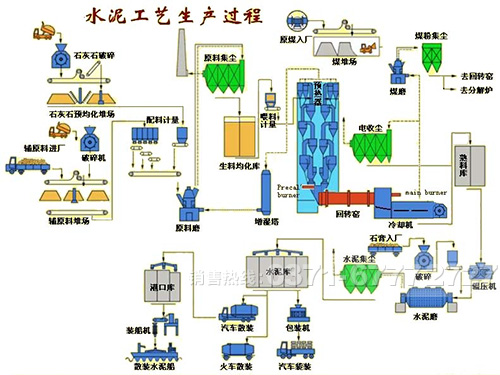 首先第一步是破碎及预均化,对石灰石、黏土、铁矿石及煤等大块物料进行破碎,原料预均化的主要目的是使原料堆场同时具备贮存于均化的功能。接下来是生料的制备,每生产1吨硅酸盐水泥至少粉磨3吨物料,包括各种原料、燃料、熟料等。第三步生料均化,利用不同的流化空气,最终使库内的物料产生径向均化。第四步预热分解,主要目的是使生料于窑内排出的炙热气体充分混合。接下来是水泥熟料进入回转窑烧成,之后将水泥粉磨成适宜的力度,最后采用袋装或者散装进行包装即可。
